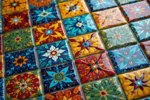 Close-up of colorful mosaic ceramic tiles with intricate designs, pattern, broken, Spain