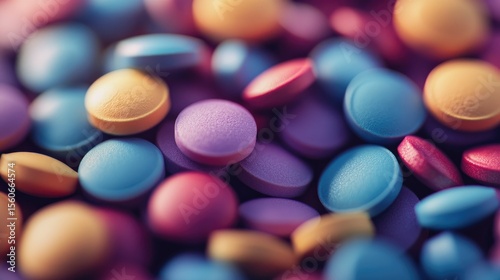 Close-up of colorful pills. A multitude of round, colorful pills in various shades of orange, blue, pink, and purple. Focus on the pills in the foreground
