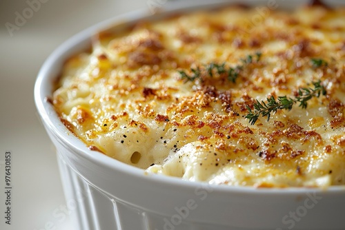 Close-up of Creamy Baked Macaroni and Cheese with Thyme and Pepper