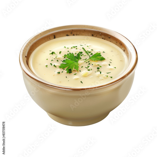 Close-up of creamy soup garnished with fresh parsley in a ceramic bowl. Perfect for food blogs, menus, and culinary presentations.