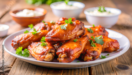 Close-up of crispy buffalo chicken wings coated in spicy hot sauce, garnished with fresh parsley, served on rustic wooden table with ranch and blue cheese dipping sauces