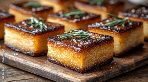 Close-up of crispy, caramelized, square-shaped potato bites garnished with rosemary sprigs and salt on a wooden board.