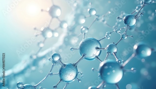 Close-up of crystal lattice composed of water molecules. Repeating pattern of H2O molecules creates order and symmetry. Water molecules arranged in structured grid on light blue background.