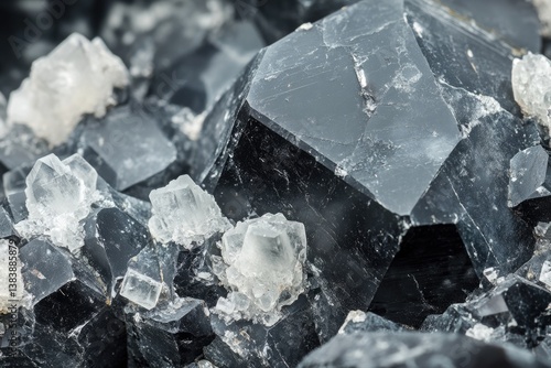 Close-up of dark crystals intergrown with clear, cubic crystals, showcasing their geometric facets and textures.