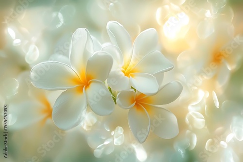 Closeup of delicate white and yellow plumeria flowers with soft bokeh background