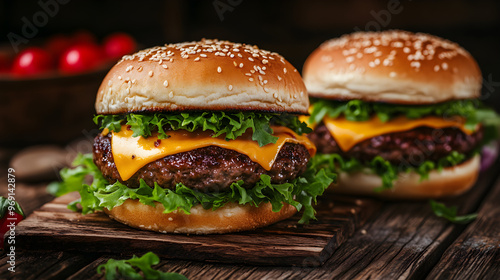 Close-Up of Delicious Juicy Cheeseburgers with Lettuce, Tomato, and Pickles. Ai generative.