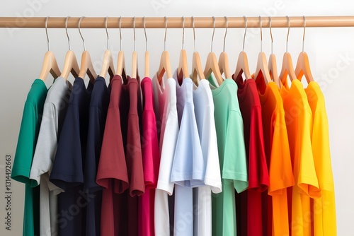 clothing, fashion, textile, garment, apparel, style, clothes rack, closet, rack, collection, hanging, hanger, wood, material, colourful, vibrant, high-coloured, bright, many-coloured, variety, many, diverse, assortment, selection, studio, background, copy space, copy space, blank, white, minimal, simple, clean, t-shirt, shirt, top, casual attire, formal, pattern, texture