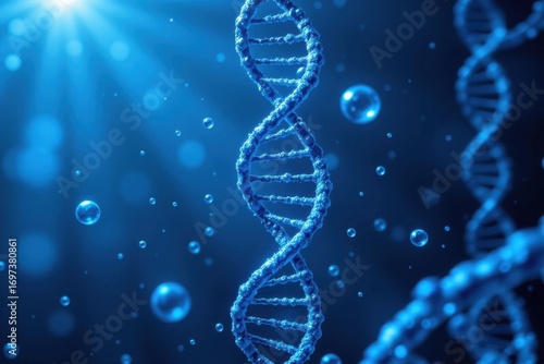 Close-up of double helix DNA strands with blue glowing particles and bubbles in a scientific laboratory background illustrating genetics and molecular biology concepts