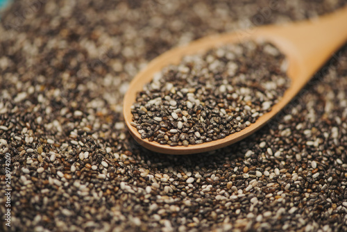 Close-up of ealthy chia seeds in a spoon. Text space.