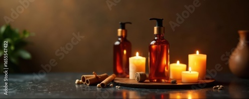 Close-up of elegant dark amber glass bottles and candles Luxury spa setting , sophisticated, container