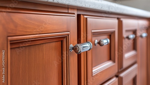 Close-up of Elegant Wooden Kitchen Cabinets with Polished Chrome Hardware