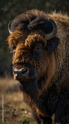 Close-Up of European Bison with Thick Curly Mane and Curved Horns