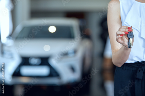 Close-up of female hands holding car keys. First car purchase at a car dealership