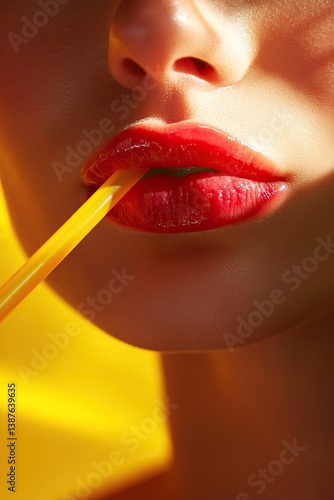 Close-up of female lips with red lipstick and yellow straw
