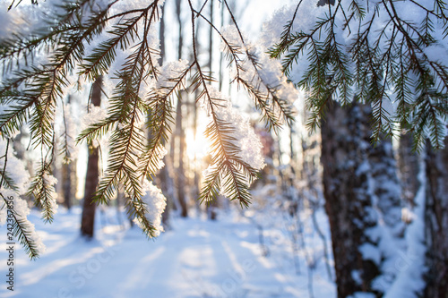 Close-up of fir branches with flakes of snow, with the dawn sun on the background. Christmas frosty morning. Winter landscape, Tranquil nature in sunlight in park