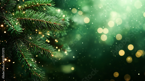 Closeup of fir tree branch with bokeh lights rich emerald needles contrast with soft focus background evokes cozy christmas mood