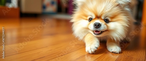 Close-up of fluffy Pomeranian's paws tapping hardwood floor; cheerful expression, close-up, cute