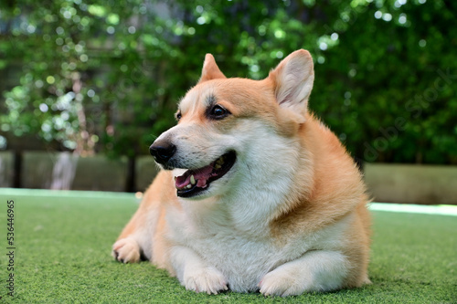Closeup of Foreign Dog Breeds lying on the artificial grass Inside a pet shop in Thailand.
