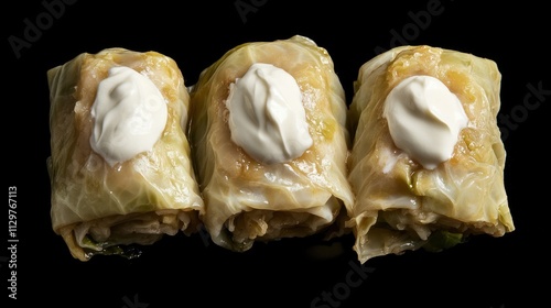 Close-up of four cabbage rolls topped with sour cream isolated on black background.