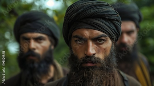 Close-up of four men with beards and black turbans, wearing dark , looking at the camera with very serious expressions in a serious atmosphere