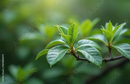 Close-up of fresh green Japanese camellia leaves on a branch. Natural leafy background with soft bokeh. Spring foliage detail captures growth and renewal in a garden setting.