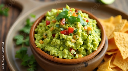 guacamole, avocado, dip, bowl, food, cookery, mexican, fresh, healthy, snack, delicious, tasty, cilantro, herb, chips, tortilla, corn, dish, plate, wooden, table, background, brown, green, red, yellow, texture, closeup, epicure, culinary, meal, ingredient, vegetarian, vegan, organic, homemade, traditional, rustic, serving, portion, prepared, presentation, vibrant, colourful, nourishment, diet, fiber, vitamin