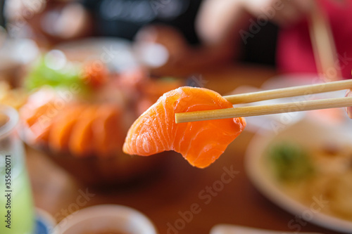 Closeup of fresh raw salmon, sushi, sashimi.