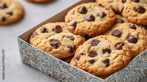 chocolate, chips, cookie, freshly, baked, decorative, gift, box, closeup, soft, sharpened, generous, copy, space, neutral, background, delicious, sweet, tempting, indulgent, tasty, mouth-watering, irresistable, homemade, warm, gooey, chewy, crispy, buttery, gold, brown, fragrant, inviting, delectable, deliciously, delightful, deliciously, flavorful, satisfying, comforting, nostalgic, festive, celebratory, present, package, container, wrapping, food, dessert