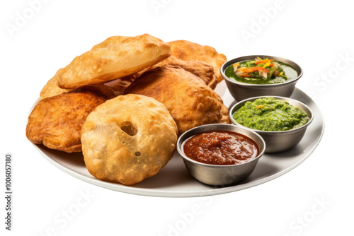 Close-up of freshly fried kachoris with a crunchy exterior, sweet tamarind chutney against a white background