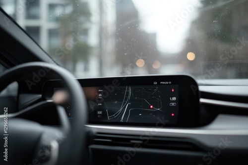 close-up of futuristic dashboard in electric car showing navigation and energy efficiency stats