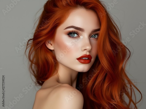 ginger, redhead, woman, fiery, hair, curly, wavy, long hair, red hair, portrait, red lipstick, closeup, stunning, beauty, natural, attractive, female, model, elegant, vibrant, fashion, coiffure, red, auburn, confident, seductive, stylish, sensual, gorgeous, make-up, lip, skin, closeup, sensuality, lipstick, face, make-up, eye, long, person, lady, studio, style, glamour, care