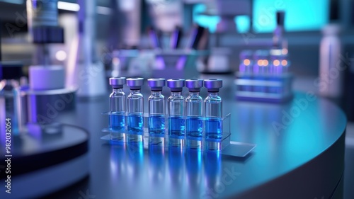 Close-up of glass vials filled with blue liquid in a modern laboratory setting, highlighting advanced medical research.