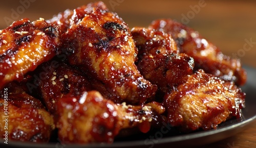 Close-up of glazed spicy chicken wings on a plate.