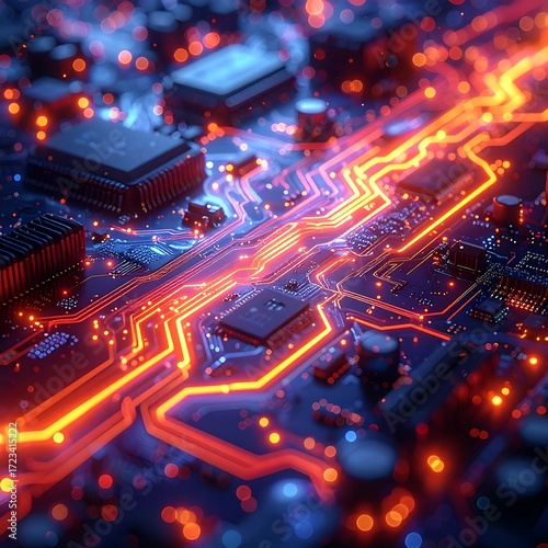 circuit, board, technology, electronic, glowing, bright, orange, red, blue, component, chips, micro, detail, tech, modern, innovation, connection, power, advanced, futuristic, pattern, line, energy, complex, abstract