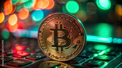 Close-up of Glowing Cryptocurrency Token with 'B' Logo Against a Blurred, Set Against High-Tech Abstract Background