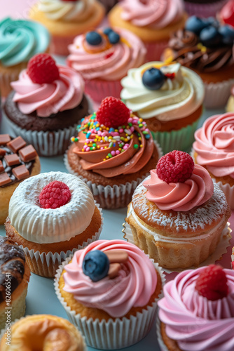 vibrant, photo, display, festive, good, party, frosting, cupcake, variety, item, closeup, icing, treat, dessert, snack, decorated, epicure, berry, bakery, colourful, confectionery, pastry, sweet, food, table, delicious, swirled