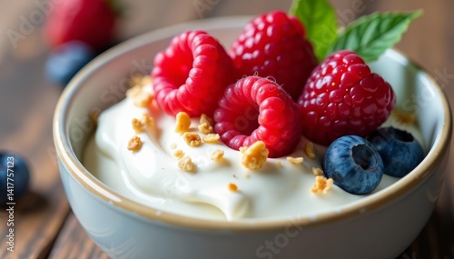Close-up of greek yogurt with raspberries, blueberries, granola, diet, fruit, berries