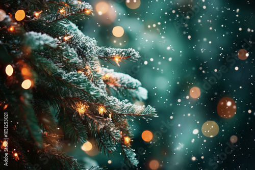 Close-up of green fir branches against the backdrop of snowfall