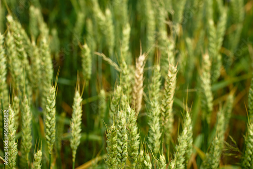 Close-up of green wheat spikes growing in field at summer day. Concept of agriculture, crop cultivation, organic farming and sustainable food production