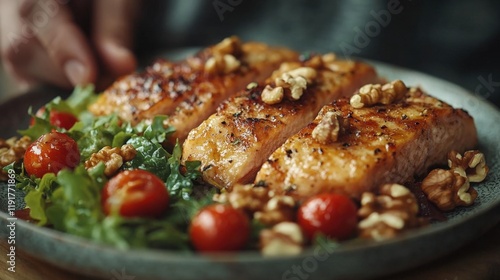 Close-up of grilled salmon fillets with walnuts and a side salad of cherry tomatoes and greens, plated on a dark grey dish