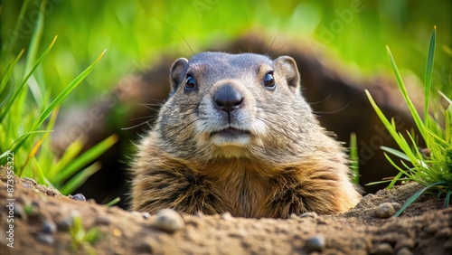 Close-up of groundhog emerging from its burrow on Groundhog Day, groundhog, burrow, emerging, animal, wildlife, rodent
