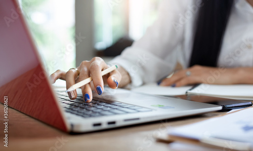 Close-up of hand young asian woman using laptop working and meeting online from home