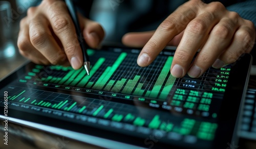 finance, financial, datum, analysis, tablet, graph, chart, number, market, stock, business, investment, trading, technology, digital, screen, closeup, hand, person, man, green, dark, background, stylus, device, touch screen, information, growth, trend, statistic, economy, monitoring, planning, strategy, report, progress, performance, result, profit, loss, indicator