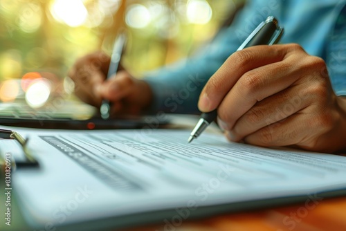 Closeup of hands filling out paperwork with a pen. A businessperson working at a desk. Focus on the hand and pen.