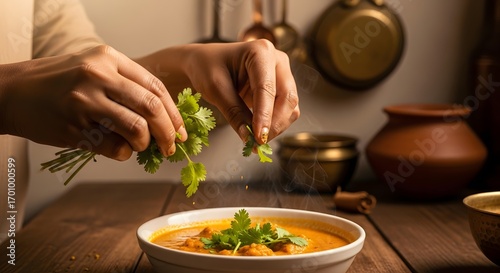 hand, garnishing, cilantro, fresh, green, herb, bowl, soup, curry, food, cooking, kitchen, rustic, wooden, table, preparing, meal, healthy, delicious, aroma, culinary, chef, home, domestic, ingredient, spice, favor, vibrant, orange, warm, comfort, nourishment, organic, natural, plant, leaf, garnish, sprinkle, summing, finish, presentation, art, skill, traditional, homemade, wholesome, dinner, lunch, dinner