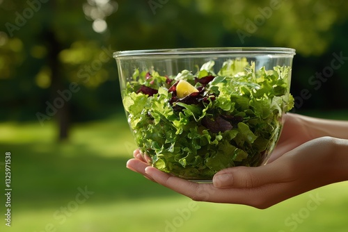 Close-up of hands holding a glass bowl filled with fresh salad in a garden setting, promoting healthy eating and a connection with nature and wellness.
