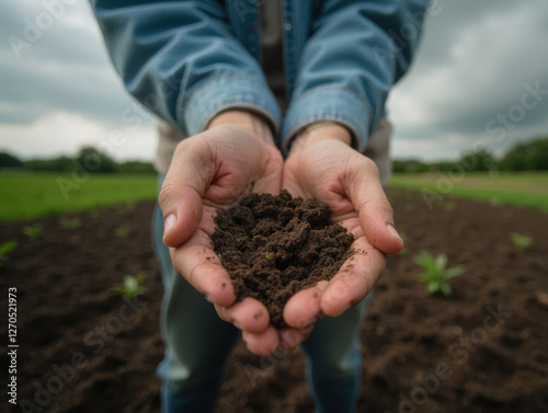 hand, dirtied, field, closeup, cloudy, agriculture, nature, earth, farming, environment, green, growth, cultivation, landscape, rural, organic, land, garden, plant, nurture, sustainability, dirt, ecology, countryside, fertile, lifestyle, harvest, holding, fresh, texture, horizon, life, season, wellness, healthy, flora, medium