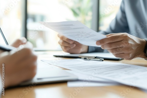 hand, hand, finger, paper, document, document, paperwork, review, reviewing, desk, table, wood, wooden, office, business, work, workplace, meeting, discussion, contract, agreements, signature, pen, person, people, businessperson, businessman, professional, detail, focused, serious, light, bright, white, grey, blur, background, laptop, clipboard