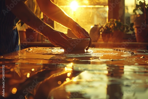 Close-up of hands shaping clay on pottery wheel in a sunlit studio. Warm sunlight casts golden glow, enhancing reflections and creating peaceful and creative atmosphere.