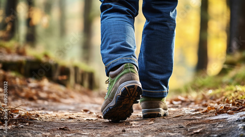 Closeup of hiking shoes and jeans walking on a woodland path in autumn